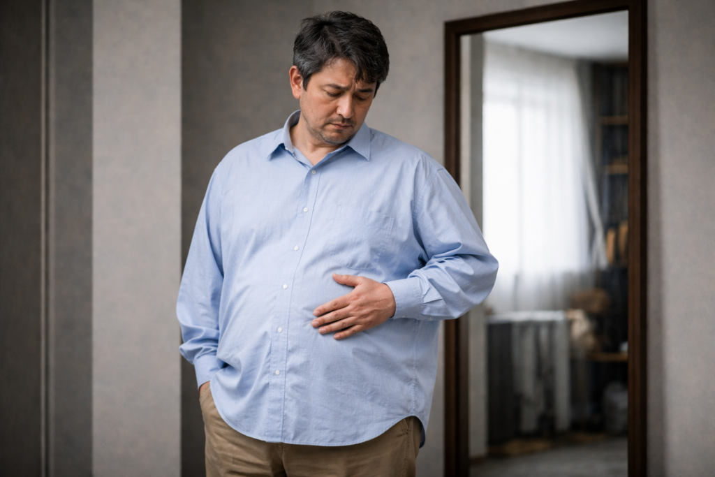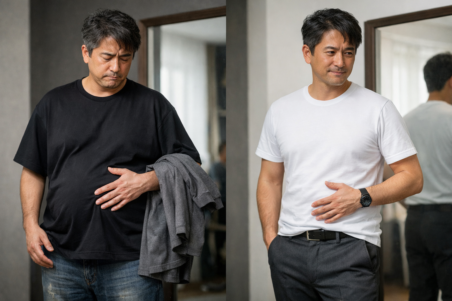 40代以降の体型変化は「太くなる」のではなく、「前に出る」ことが特徴です。