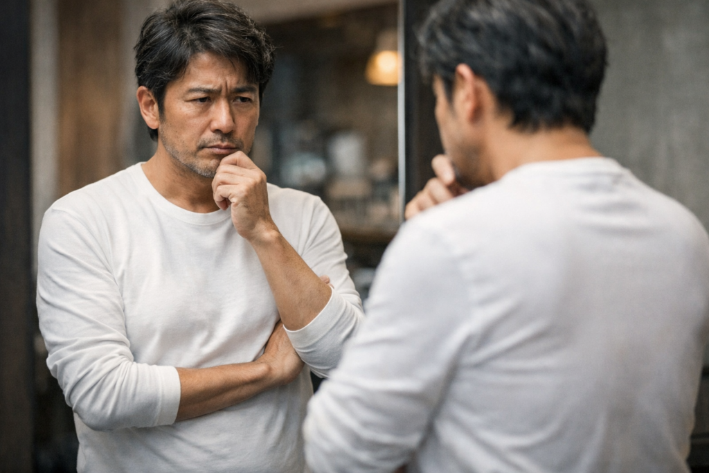 40代・50代のお悩み相談, 40代・50代向けファッション術, 60代向けファッション術, ファッションNG・改善, 大手メーカー・既製品比較Tシャツが似合わない40代の原因|胸の肉が目立つ人が避けるべき3点 2025年12月18日