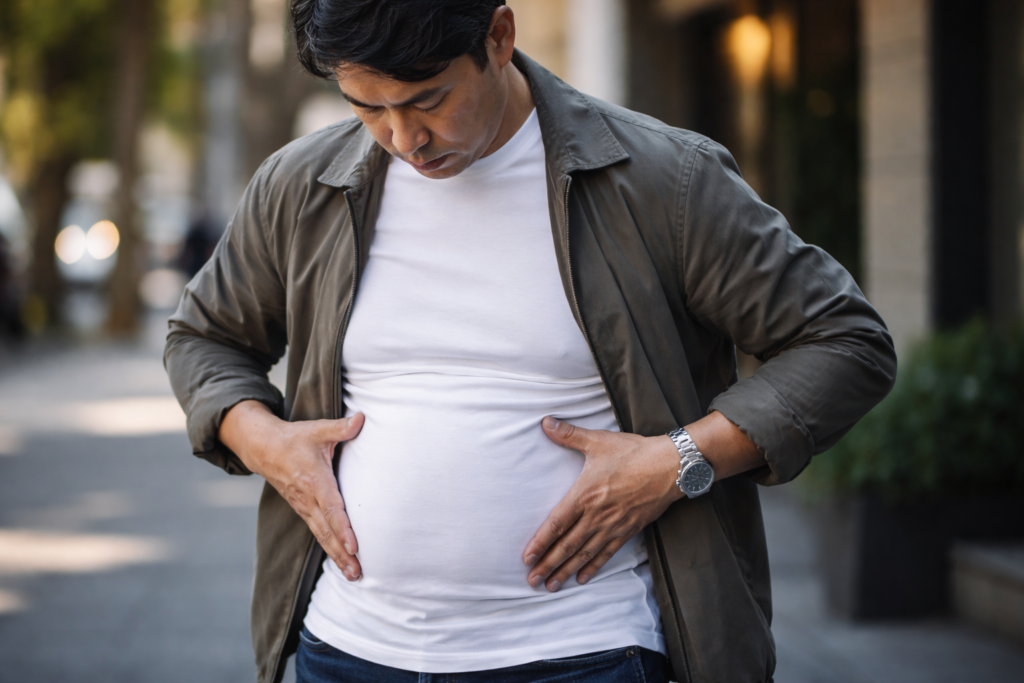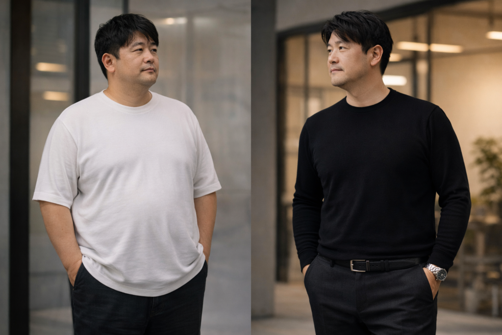 40代・50代のお悩み相談, 40代・50代向けファッション術, お腹・体型カバー, ファッションNG・改善, 大手メーカー・既製品比較40〜50代男性向け|「サイズを上げるほど太って見える」本当の原因とポッコリお腹・胸のぜい肉を隠す体型カバー服の選び方 2026年1月19日