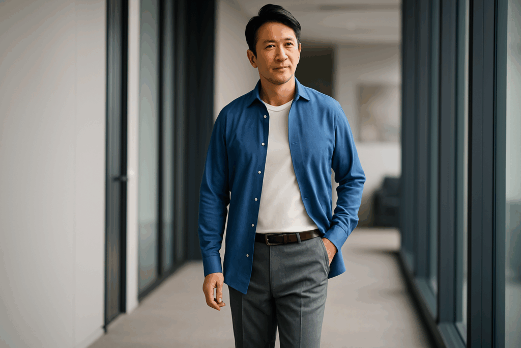 40代・50代のお悩み相談, 40代・50代向けファッション術, ファッションNG・改善【読まれています】お腹が出てもシャツは似合う。細見えする大人の「前開きシャツ」着こなし術と選び方の正解 2025年10月8日