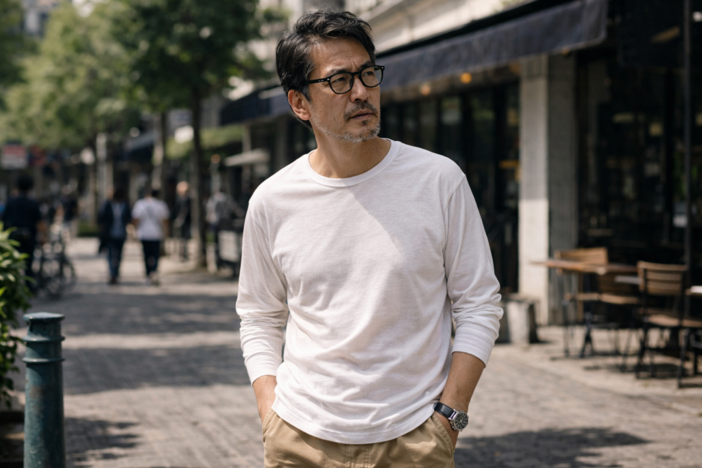 50代男性が意識すべきなのは、見た目の派手さではなく“質感の整い”と“シルエットを支える素材”です。