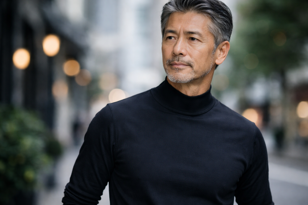 40〜60代の男性は、肌の質感・筋肉のハリ・骨格の変化などにより、首元の服が「似合わない」「だらしなく見える」と感じる瞬間が増えてきます。