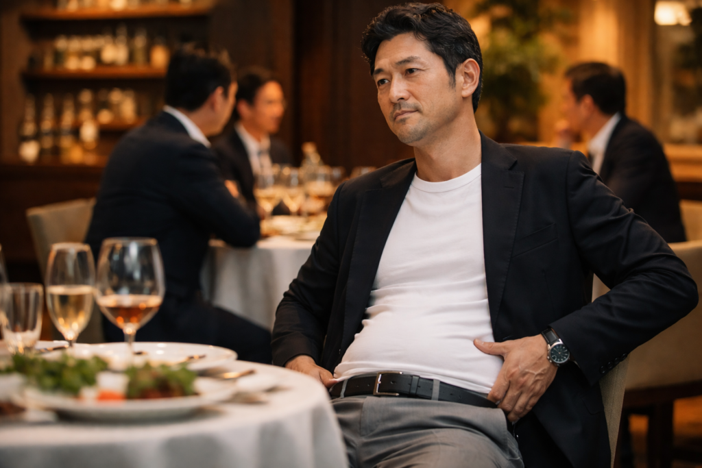 会食後に椅子へ深く腰掛けた瞬間、ゴルフ後にクラブハウスで着替えた瞬間、ウエスト周りの締めつけを強く感じた経験はないでしょうか。